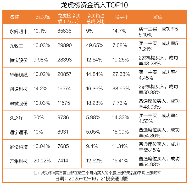 12月16日,上证指数下跌1.11%,深证成指下跌1.51%,创业板指下跌2.1%。盘后龙虎榜数据显示,共有52只个股因当日异动登上龙虎榜,资金净流入最多的是永辉超市(601933.SH),达6.56亿元。