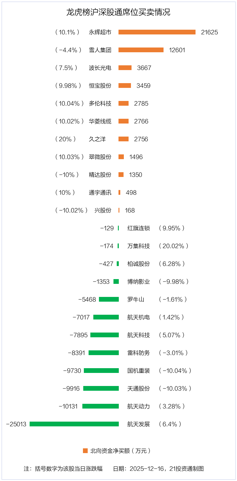 12月16日,北向资金参与龙虎榜中的个股共有23只,合计净卖出3.25亿元。其中沪股通净买入4 股,净卖出5 股,合计净卖出9964.94万元;深股通净买入7 股,净卖出7 股,合计净卖出2.25亿元。