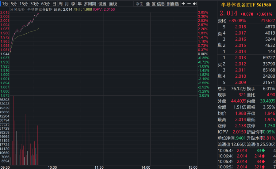 (原标题:存储芯片高开走强!珂玛科技涨停,上游半导体设备ETF(561980)盘中拉涨3.6%)