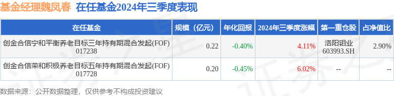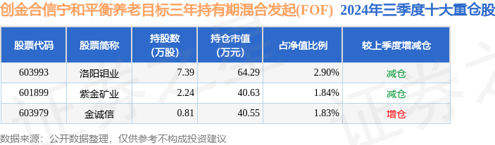 从基金规模来看,创金合信宁和平衡养老目标三年持有期混合发起(FOF)基金2024年三季度公布的基金规模为0.22亿元,较上一期规模2126.68万元变化了87.37万元,环比变化了4.11%。该基金最新一期资产配置为:股票占净值比6.57%,债券占净值比5.5%,现金占净值比0.94%。从基金持仓来看,该基金当季前十大股票仓位达6.57%,第一大重仓股为洛阳钼业(603993),持仓占比为2.9%。