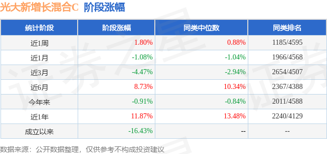 从业绩表现来看,光大新增长混合C基金过去一年净值涨幅为6.1%,在同类基金中排名2025/3979,同类基金过去一年净值涨幅中位数为5.4%。而基金过去一年的最大回撤为-17.45%,成立以来的最大回撤为-30.92%。