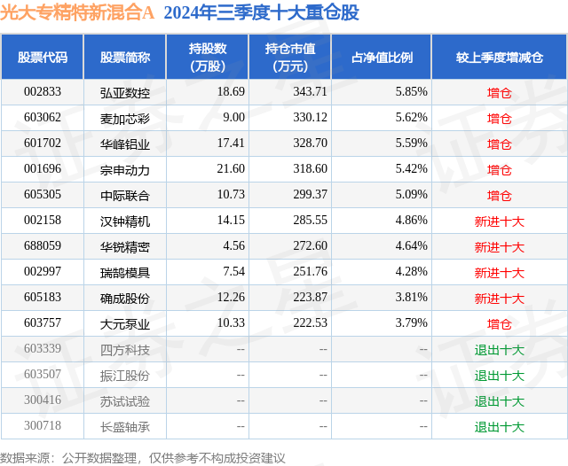 从基金规模来看,光大专精特新混合A基金2024年三季度公布的基金规模为0.41亿元,较上一期规模3826.56万元变化了235.59万元,环比变化了6.16%。该基金最新一期资产配置为:股票占净值比93.25%,无债券类资产,现金占净值比7.82%。从基金持仓来看,该基金当季前十大股票仓位达48.95%,第一大重仓股为弘亚数控(002833),持仓占比为5.85%。