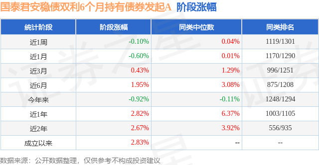 证券之星消息,日前国泰君安稳债双利6个月持有债券发起A基金公布三季报,2024年三季度最新规模0.41亿元,季度净值涨幅为0.64%。