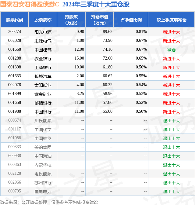 从基金规模来看,国泰君安君得盈债券C基金2024年三季度公布的基金规模为0.44亿元,较上一期规模4522.85万元变化了-75.63万元,环比变化了-1.67%。该基金最新一期资产配置为:股票占净值比15.2%,债券占净值比89.36%,现金占净值比9.39%。从基金持仓来看,该基金当季前十大股票仓位达6.0%,第一大重仓股为阳光电源(300274),持仓占比为0.81%。