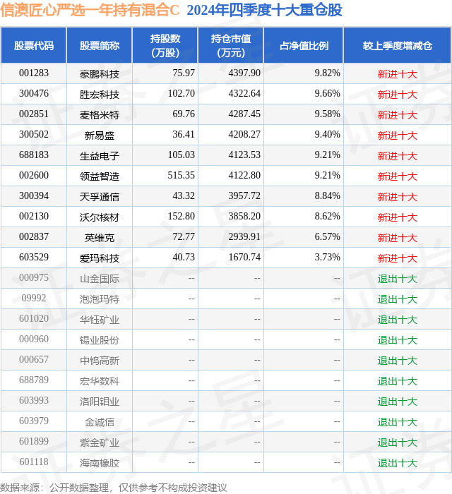 证券之星消息,日前信澳匠心严选一年持有混合C基金公布四季报,2024年四季度最新规模0.64亿元,季度净值涨幅为1.43%。