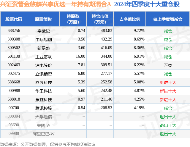 从基金规模来看,兴证资管金麒麟兴享优选一年持有期混合A基金2024年四季度公布的基金规模为0.24亿元,较上一期规模2990.39万元变化了-602.56万元,环比变化了-20.15%。该基金最新一期资产配置为:股票占净值比90.1%,债券占净值比5.7%,现金占净值比2.06%。从基金持仓来看,该基金当季前十大股票仓位达63.86%,第一大重仓股为寒武纪(688256),持仓占比为9.72%。