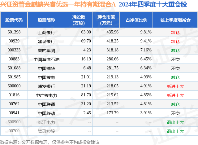 证券之星消息,日前兴证资管金麒麟兴睿优选一年持有期混合A基金公布四季报,2024年四季度最新规模0.08亿元,季度净值涨幅为0.38%。