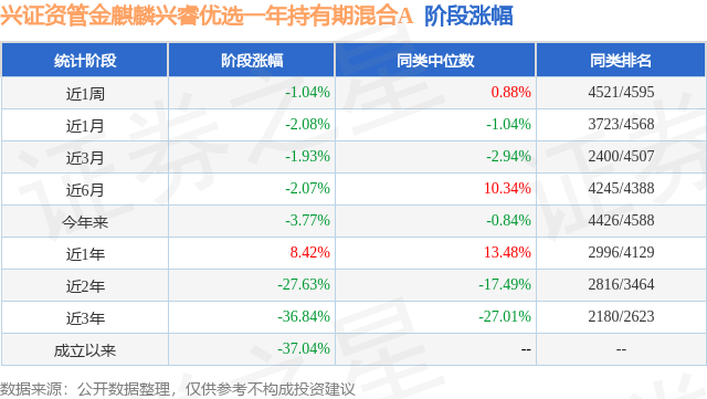 从业绩表现来看,兴证资管金麒麟兴睿优选一年持有期混合A基金过去一年净值涨幅为8.42%,在同类基金中排名2996/4129,同类基金过去一年净值涨幅中位数为13.48%。而基金过去一年的最大回撤为-10.04%,成立以来的最大回撤为-43.69%。