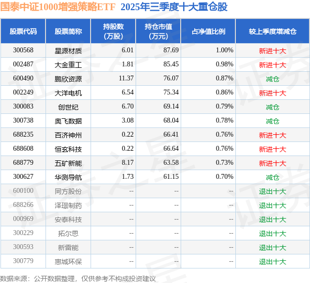 从基金规模来看,国泰中证1000增强策略ETF基金2025年三季度公布的基金规模为0.87亿元,较上一期规模9954.14万元变化了-1221.05万元,环比变化了-12.27%。该基金最新一期资产配置为:股票占净值比96.23%,债券占净值比0.03%,现金占净值比3.48%。从基金持仓来看,该基金当季前十大股票仓位达8.23%,第一大重仓股为星源材质(300568),持仓占比为1.0%。