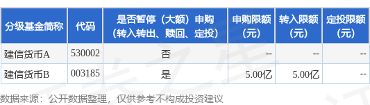 证券之星消息,11月15日建信基金管理有限责任公司发布《建信货币市场基金B类基金份额在中国建设银行销售渠道暂停大额申购、大额转换转入、定期定额投资公告》。公告中提示,None,自2025年11月17日起建信货币市场基金B类基金份额在中国建设银行销售渠道暂停大额申购、大额转换转入、定期定额投资,下属分级基金调整明细如下: