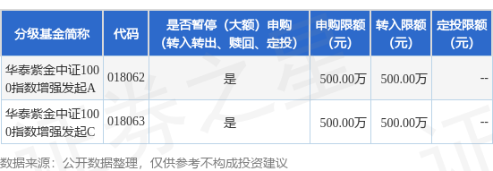 注:为维护基金份额持有人的利益,华泰证券(上海)资产管理有限公司(以下简称“本公司”)决定自2025年12月1日单日每个基金账户累计申购、定期定额申购及转换转入华泰紫金中证1000指数增强型发起式证券投资基金各类份额合计金额分别不超过人民币500万元,若超过上述金额,本公司有权部分或全部拒绝该笔申购申请。本基金限制大额申购业务期间,本公司将正常办理本基金的赎回业务。本基金恢复办理大额申购业务的具体时间将另行公告。