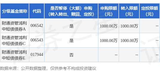 注:(1)根据法律法规和基金合同的相关规定,自2025年12月05日起,财通证券资产管理有限公司(以下简称“本公司”)将调整财通资管鸿利中短债债券型证券投资基金(以下简称“本基金”)A类、C类份额的大额申购(含转换转入、定期定额投资)业务。届时起,若单日单个基金账户的单笔申购(含转换转入、定期定额投资)金额超过人民币1000万元(不含)的,本公司将有权对超过1000万元的部分予以拒绝。若单日单个基金账户多笔累计申购(含转换转入、定期定额投资)金额超过人民币1000万元的,则对申请按照申请金额从大到小排序,逐笔累加至符合不超过人民币1000万元(含)限额的申请确认成功,对超过1000万元的部分及其余笔数本公司将有权予以拒绝。本基金A类、C类份额分别单独进行判断。