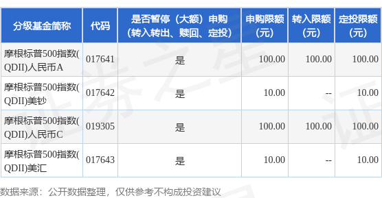 证券之星消息,12月11日摩根基金管理(中国)有限公司发布《摩根标普500指数型发起式证券投资基金(QDII)调整大额申购、定期定额投资及转换转入业务的公告》。公告中提示,为保证本基金的稳定运作,保护基金份额持有人利益,自2025年12月11日起摩根标普500指数型发起式证券投资基金(QDII)调整大额申购、定期定额投资及转换转入业务,下属分级基金调整明细如下: