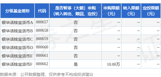 注:1、银华基金管理股份有限公司决定2025年12月30日(含2025年12月30日)起暂停除兴业银行股份有限公司、中国邮政储蓄银行股份有限公司、中信银行股份有限公司、平安银行股份有限公司、中国民生银行股份有限公司、宁波银行股份有限公司、杭州银行股份有限公司、招商银行股份有限公司、上海长量基金销售有限公司以外的代销机构的机构投资者办理银华活钱宝货币市场基金(以下简称“本基金”)F类基金份额10万元以上的大额申购(含定期定额投资及转换转入)业务,自2025年12月31日(含2025年12月31日)起,暂停上海长量基金销售有限公司的机构投资者办理本基金F类基金份额10万元以上的大额申购(含定期定额投资及转换转入)业务。敬请投资者留意。