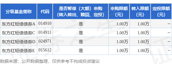 证券之星消息,12月30日上海东方证券资产管理有限公司发布《东方红短债债券型证券投资基金暂停代销机构大额申购(含转换转入、定期定额投资)业务的公告》。公告中提示,为保护基金份额持有人的利益,自2025年12月30日起东方红短债债券型证券投资基金暂停代销机构大额申购(含转换转入、定期定额投资)业务,申购、转换转入上限金额为1.0万元,下属分级基金调整明细如下: