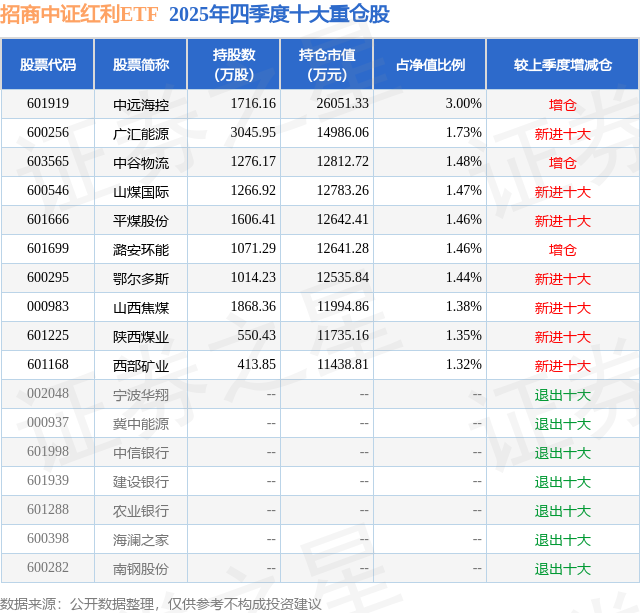 从基金规模来看,招商中证红利ETF基金2025年四季度公布的基金规模为86.81亿元,较上一期规模75.93亿元变化了10.88亿元,环比变化了14.34%。该基金最新一期资产配置为:股票占净值比99.56%,无债券类资产,现金占净值比0.4%。从基金持仓来看,该基金当季前十大股票仓位达16.09%,第一大重仓股为中远海控(601919),持仓占比为3.0%。
