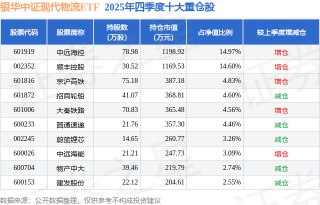 从基金规模来看,银华中证现代物流ETF基金2025年四季度公布的基金规模为0.8亿元,较上一期规模8258.46万元变化了-248.69万元,环比变化了-3.01%。该基金最新一期资产配置为:股票占净值比98.07%,无债券类资产,现金占净值比2.13%。从基金持仓来看,该基金当季前十大股票仓位达59.66%,第一大重仓股为中远海控(601919),持仓占比为14.97%。