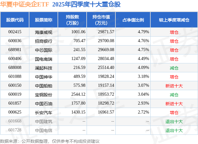 从基金规模来看,华夏中证央企ETF基金2025年四季度公布的基金规模为62.41亿元,较上一期规模59.7亿元变化了2.7亿元,环比变化了4.52%。该基金最新一期资产配置为:股票占净值比99.65%,无债券类资产,现金占净值比0.34%。从基金持仓来看,该基金当季前十大股票仓位达37.82%,第一大重仓股为海康威视(002415),持仓占比为4.79%。