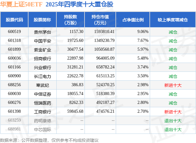 从基金规模来看,华夏上证50ETF基金2025年四季度公布的基金规模为759.22亿元,较上一期规模1804.54亿元变化了-45.32亿元,环比变化了-2.51%。该基金最新一期资产配置为:股票占净值比98.06%,无债券类资产,现金占净值比1.71%。从基金持仓来看,该基金当季前十大股票仓位达46.85%,第一大重仓股为贵州茅台(600519),持仓占比为9.06%。