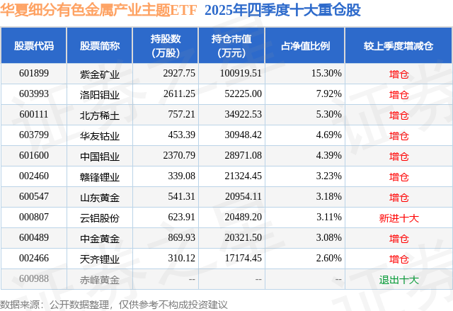从基金规模来看,华夏细分有色金属产业主题ETF基金2025年四季度公布的基金规模为65.95亿元,较上一期规模9.28亿元变化了56.67亿元,环比变化了610.64%。该基金最新一期资产配置为:股票占净值比99.66%,无债券类资产,现金占净值比2.1%。从基金持仓来看,该基金当季前十大股票仓位达52.8%,第一大重仓股为紫金矿业(601899),持仓占比为15.3%。