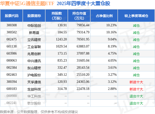 从基金规模来看,华夏中证5G通信主题ETF基金2025年四季度公布的基金规模为78.03亿元,较上一期规模96.4亿元变化了-18.37亿元,环比变化了-19.06%。该基金最新一期资产配置为:股票占净值比99.54%,无债券类资产,现金占净值比1.1%。从基金持仓来看,该基金当季前十大股票仓位达59.3%,第一大重仓股为中际旭创(300308),持仓占比为10.23%。
