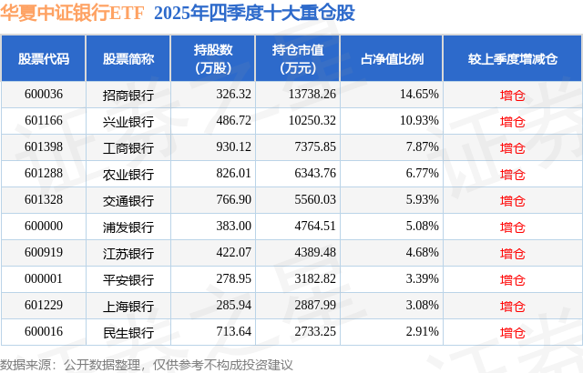 证券之星消息,日前华夏中证银行ETF基金公布四季报,2025年四季度最新规模9.38亿元,季度净值涨幅为6.1%。