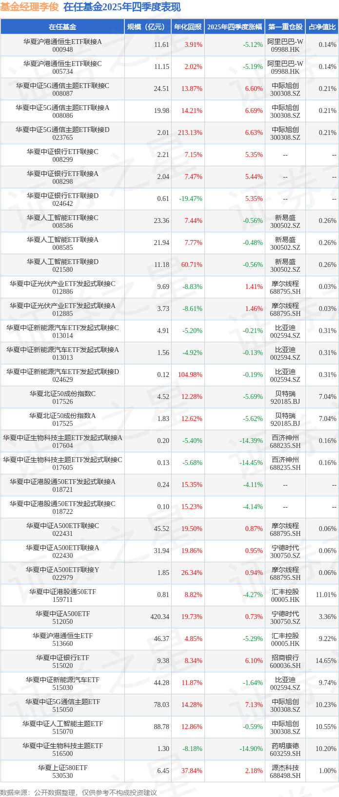 华夏中证银行ETF现任基金经理为李俊。其中在任基金经理李俊已从业8年又44天,2019年10月24日正式接手管理华夏中证银行ETF,任职期间累计回报为65.0%。目前还管理着34只基金产品(包括A类和C类),其中本季度表现最佳的基金为华夏中证5G通信主题ETF(515050),季度净值涨幅为7.13%。