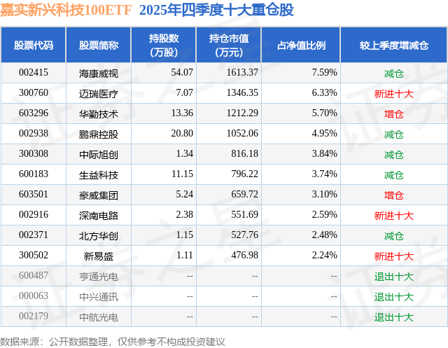 从基金规模来看,嘉实新兴科技100ETF基金2025年四季度公布的基金规模为2.13亿元,较上一期规模2.43亿元变化了-3016.53万元,环比变化了-12.42%。该基金最新一期资产配置为:股票占净值比99.15%,无债券类资产,现金占净值比0.91%。从基金持仓来看,该基金当季前十大股票仓位达42.56%,第一大重仓股为海康威视(002415),持仓占比为7.59%。