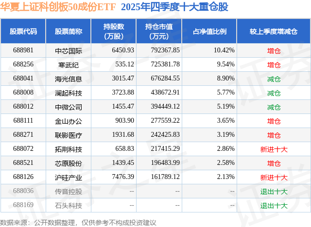 从基金规模来看,华夏上证科创板50成份ETF基金2025年四季度公布的基金规模为760.22亿元,较上一期规模756.2亿元变化了4.02亿元,环比变化了0.53%。该基金最新一期资产配置为:股票占净值比99.32%,无债券类资产,现金占净值比0.83%。从基金持仓来看,该基金当季前十大股票仓位达54.23%,第一大重仓股为中芯国际(688981),持仓占比为10.42%。