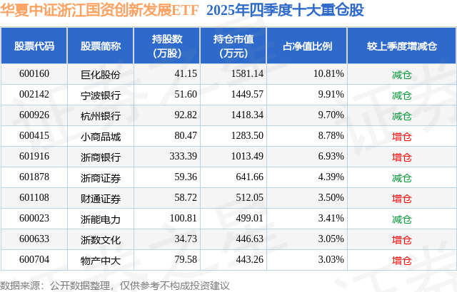 从基金规模来看,华夏中证浙江国资创新发展ETF基金2025年四季度公布的基金规模为1.46亿元,较上一期规模1.54亿元变化了-743.04万元,环比变化了-4.84%。该基金最新一期资产配置为:股票占净值比99.22%,无债券类资产,现金占净值比0.91%。从基金持仓来看,该基金当季前十大股票仓位达63.51%,第一大重仓股为巨化股份(600160),持仓占比为10.81%。