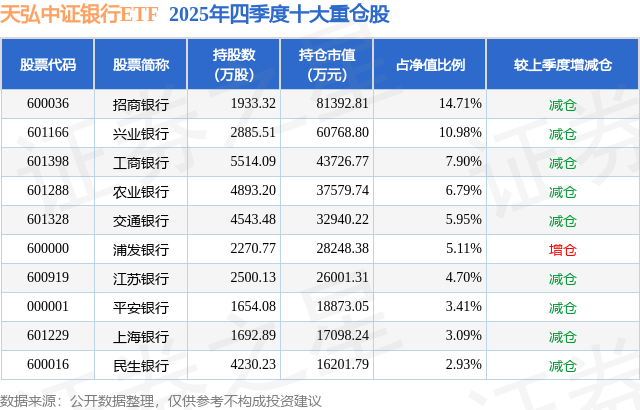 证券之星消息,日前天弘中证银行ETF基金公布四季报,2025年四季度最新规模55.32亿元,季度净值涨幅为6.06%。