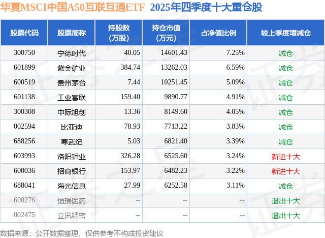从基金规模来看,华夏MSCI中国A50互联互通ETF基金2025年四季度公布的基金规模为20.13亿元,较上一期规模25.53亿元变化了-5.4亿元,环比变化了-21.15%。该基金最新一期资产配置为:股票占净值比98.63%,无债券类资产,现金占净值比1.28%。从基金持仓来看,该基金当季前十大股票仓位达44.68%,第一大重仓股为宁德时代(300750),持仓占比为7.25%。