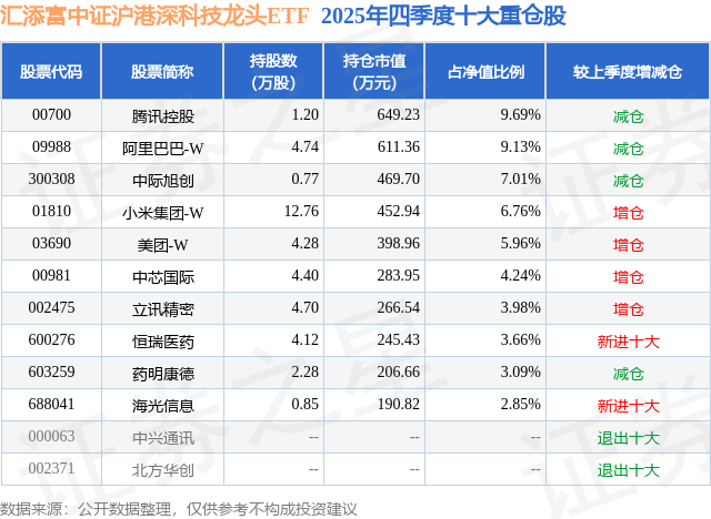 从基金规模来看,汇添富中证沪港深科技龙头ETF基金2025年四季度公布的基金规模为0.67亿元,较上一期规模8270.42万元变化了-1573.54万元,环比变化了-19.03%。该基金最新一期资产配置为:股票占净值比97.09%,无债券类资产,现金占净值比4.56%。从基金持仓来看,该基金当季前十大股票仓位达56.37%,第一大重仓股为腾讯控股(00700),持仓占比为9.69%。
