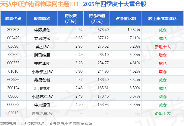 从基金规模来看,天弘中证沪港深物联网主题ETF基金2025年四季度公布的基金规模为0.53亿元,较上一期规模5659.55万元变化了-357.68万元,环比变化了-6.32%。该基金最新一期资产配置为:股票占净值比99.4%,无债券类资产,现金占净值比0.74%。从基金持仓来看,该基金当季前十大股票仓位达50.95%,第一大重仓股为中际旭创(300308),持仓占比为10.82%。
