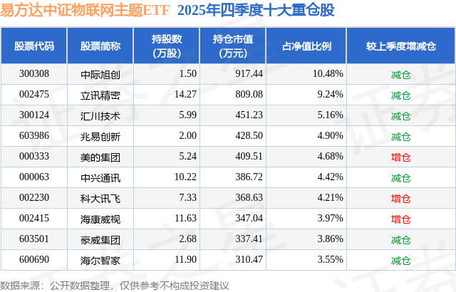 从基金规模来看,易方达中证物联网主题ETF基金2025年四季度公布的基金规模为0.88亿元,较上一期规模9373.88万元变化了-621.65万元,环比变化了-6.63%。该基金最新一期资产配置为:股票占净值比98.93%,无债券类资产,现金占净值比1.11%。从基金持仓来看,该基金当季前十大股票仓位达54.47%,第一大重仓股为中际旭创(300308),持仓占比为10.48%。
