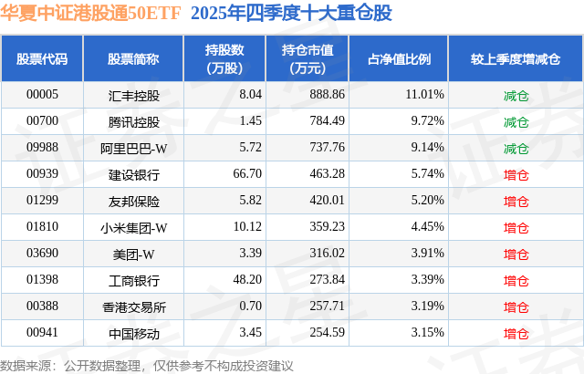 从基金规模来看,华夏中证港股通50ETF基金2025年四季度公布的基金规模为0.81亿元,较上一期规模8145.55万元变化了-71.66万元,环比变化了-0.88%。该基金最新一期资产配置为:股票占净值比98.22%,无债券类资产,现金占净值比5.1%。从基金持仓来看,该基金当季前十大股票仓位达58.9%,第一大重仓股为汇丰控股(00005),持仓占比为11.01%。