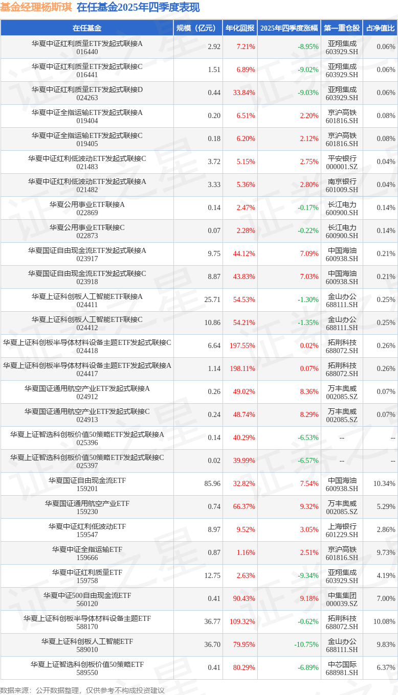 从基金规模来看,华夏中证红利质量ETF基金2025年四季度公布的基金规模为12.75亿元,较上一期规模10.21亿元变化了2.54亿元,环比变化了24.88%。该基金最新一期资产配置为:股票占净值比99.76%,无债券类资产,现金占净值比1.52%。从基金持仓来看,该基金当季前十大股票仓位达35.81%,第一大重仓股为亚翔集成(603929),持仓占比为4.19%。