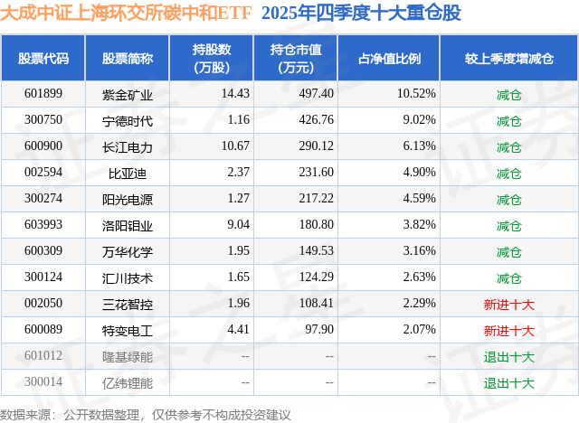 从基金规模来看,大成中证上海环交所碳中和ETF基金2025年四季度公布的基金规模为0.47亿元,较上一期规模8236.36万元变化了-3506.41万元,环比变化了-42.57%。该基金最新一期资产配置为:股票占净值比98.52%,无债券类资产,现金占净值比1.76%。从基金持仓来看,该基金当季前十大股票仓位达49.13%,第一大重仓股为紫金矿业(601899),持仓占比为10.52%。