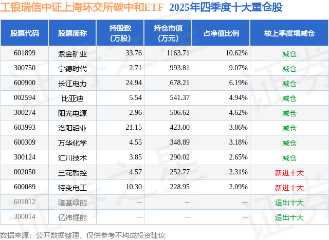 从基金规模来看,工银瑞信中证上海环交所碳中和ETF基金2025年四季度公布的基金规模为1.1亿元,较上一期规模1.73亿元变化了-6381.3万元,环比变化了-36.8%。该基金最新一期资产配置为:股票占净值比99.27%,无债券类资产,现金占净值比1.03%。从基金持仓来看,该基金当季前十大股票仓位达49.53%,第一大重仓股为紫金矿业(601899),持仓占比为10.62%。