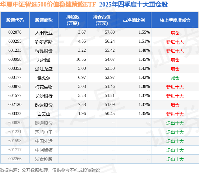 从基金规模来看,华夏中证智选500价值稳健策略ETF基金2025年四季度公布的基金规模为0.37亿元,较上一期规模3658.89万元变化了76.32万元,环比变化了2.09%。该基金最新一期资产配置为:股票占净值比95.94%,无债券类资产,现金占净值比5.86%。从基金持仓来看,该基金当季前十大股票仓位达14.31%,第一大重仓股为太阳纸业(002078),持仓占比为1.55%。