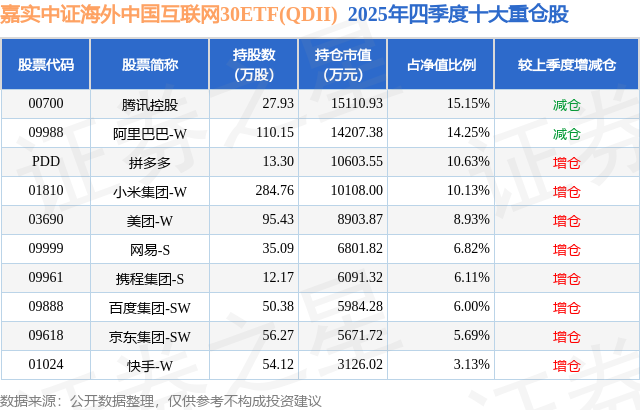 从基金规模来看,嘉实中证海外中国互联网30ETF(QDII)基金2025年四季度公布的基金规模为9.97亿元,较上一期规模10.77亿元变化了-7949.25万元,环比变化了-7.38%。该基金最新一期资产配置为:股票占净值比82.87%,无债券类资产,现金占净值比1.03%。从基金持仓来看,该基金当季前十大股票仓位达86.84%,第一大重仓股为腾讯控股(00700),持仓占比为15.15%。
