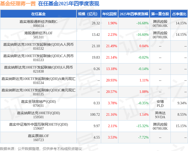 证券之星消息,日前嘉实中证海外中国互联网30ETF(QDII)基金公布四季报,2025年四季度最新规模9.97亿元,季度净值涨幅为-15.32%。
