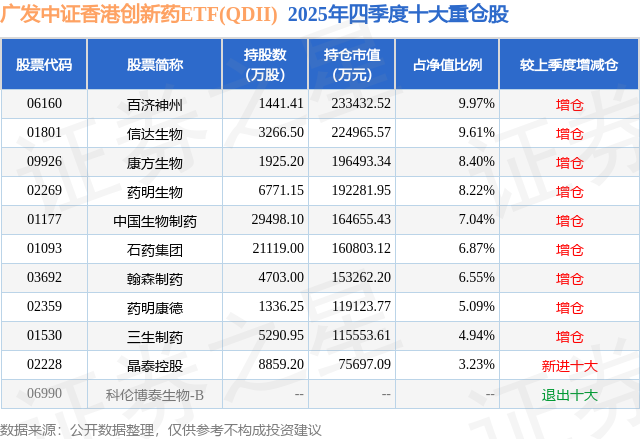 从基金规模来看,广发中证香港创新药ETF(QDII)基金2025年四季度公布的基金规模为234.03亿元,较上一期规模248.89亿元变化了-14.85亿元,环比变化了-5.97%。该基金最新一期资产配置为:股票占净值比98.7%,无债券类资产,现金占净值比2.03%。从基金持仓来看,该基金当季前十大股票仓位达69.92%,第一大重仓股为百济神州(06160),持仓占比为9.97%。