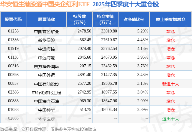 从基金规模来看,华安恒生港股通中国央企红利ETF基金2025年四季度公布的基金规模为62.39亿元,较上一期规模33.68亿元变化了28.71亿元,环比变化了85.26%。该基金最新一期资产配置为:股票占净值比97.83%,无债券类资产,现金占净值比1.76%。从基金持仓来看,该基金当季前十大股票仓位达37.04%,第一大重仓股为中国有色矿业(01258),持仓占比为5.29%。
