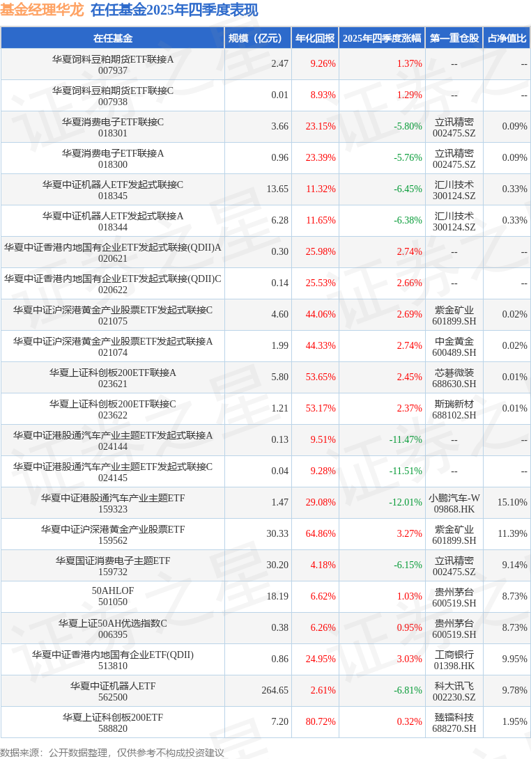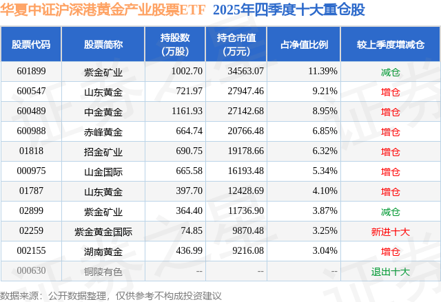 从基金规模来看,华夏中证沪深港黄金产业股票ETF基金2025年四季度公布的基金规模为30.33亿元,较上一期规模24.09亿元变化了6.25亿元,环比变化了25.94%。该基金最新一期资产配置为:股票占净值比98.07%,无债券类资产,现金占净值比2.15%。从基金持仓来看,该基金当季前十大股票仓位达62.32%,第一大重仓股为紫金矿业(601899),持仓占比为11.39%。