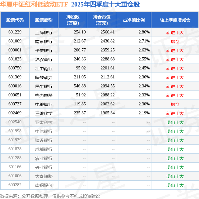 从基金规模来看,华夏中证红利低波动ETF基金2025年四季度公布的基金规模为8.97亿元,较上一期规模3.76亿元变化了5.22亿元,环比变化了138.88%。该基金最新一期资产配置为:股票占净值比99.8%,无债券类资产,现金占净值比1.3%。从基金持仓来看,该基金当季前十大股票仓位达24.72%,第一大重仓股为上海银行(601229),持仓占比为2.86%。