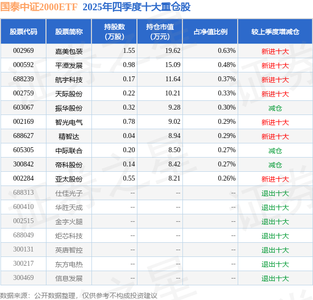 从基金规模来看,国泰中证2000ETF基金2025年四季度公布的基金规模为0.31亿元,较上一期规模3249.56万元变化了-120.19万元,环比变化了-3.7%。该基金最新一期资产配置为:股票占净值比98.11%,无债券类资产,现金占净值比1.89%。从基金持仓来看,该基金当季前十大股票仓位达3.49%,第一大重仓股为嘉美包装(002969),持仓占比为0.63%。