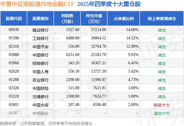 从基金规模来看,华夏中证港股通内地金融ETF基金2025年四季度公布的基金规模为25.39亿元,较上一期规模26.06亿元变化了-6706.63万元,环比变化了-2.57%。该基金最新一期资产配置为:股票占净值比98.03%,无债券类资产,现金占净值比1.07%。从基金持仓来看,该基金当季前十大股票仓位达77.2%,第一大重仓股为建设银行(00939),持仓占比为14.66%。