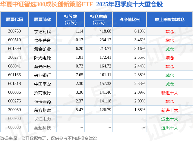 从基金规模来看,华夏中证智选300成长创新策略ETF基金2025年四季度公布的基金规模为0.68亿元,较上一期规模6351.06万元变化了410.35万元,环比变化了6.46%。该基金最新一期资产配置为:股票占净值比97.9%,无债券类资产,现金占净值比2.1%。从基金持仓来看,该基金当季前十大股票仓位达28.57%,第一大重仓股为宁德时代(300750),持仓占比为6.19%。