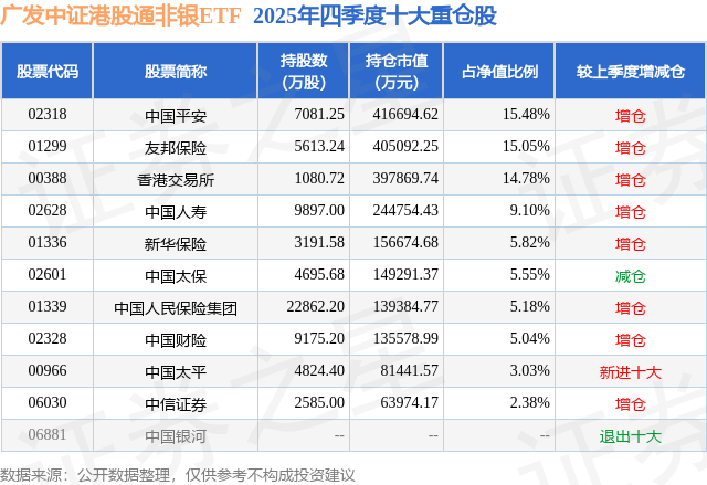 从基金规模来看,广发中证港股通非银ETF基金2025年四季度公布的基金规模为269.11亿元,较上一期规模197.42亿元变化了71.68亿元,环比变化了36.31%。该基金最新一期资产配置为:股票占净值比98.93%,无债券类资产,现金占净值比4.93%。从基金持仓来看,该基金当季前十大股票仓位达81.41%,第一大重仓股为中国平安(02318),持仓占比为15.48%。
